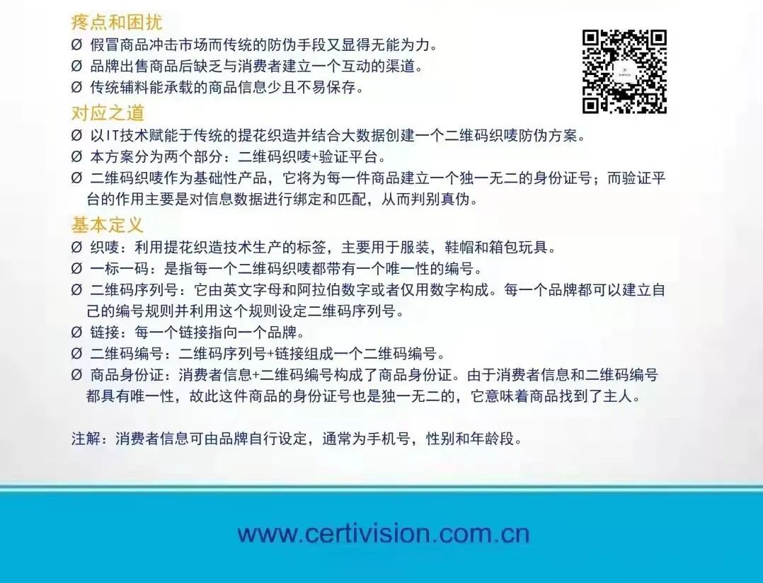 1. 以IT技術賦能于傳統的提花織造并結合大數據創建一個二維碼織嘜防偽方案。