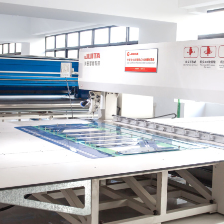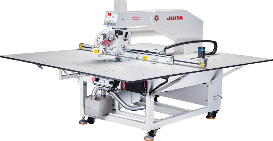 具有縫紉范圍大:200公分x130公分,可搭載激光切割裝置,機頭具備機頭升降功能,線跡360度旋轉縫紉功能。
